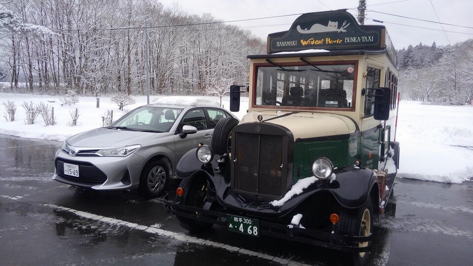 駐車場にはジャンボレトロタクシー、どんぐりとやまねこ号。現在は1日3,000円で、ここや賢治記念館などを廻っているそうです。