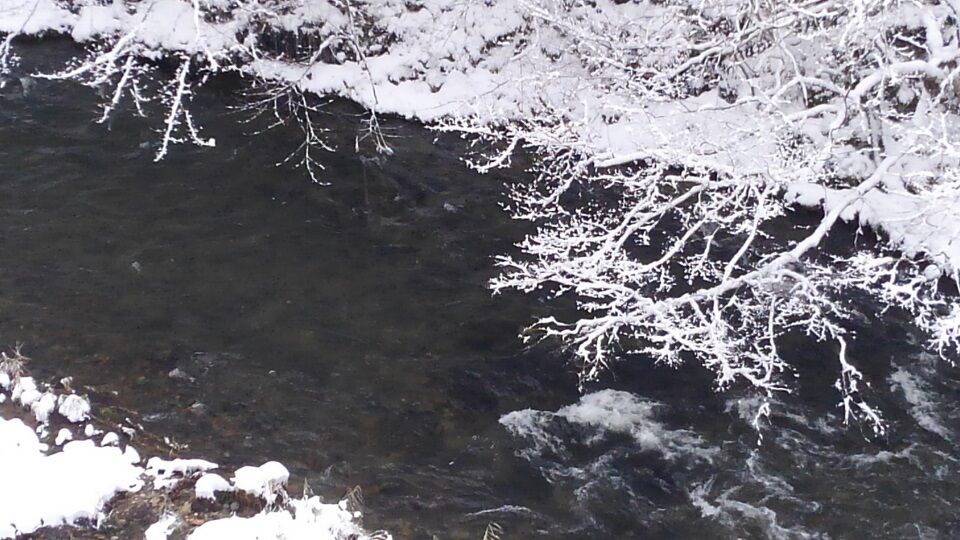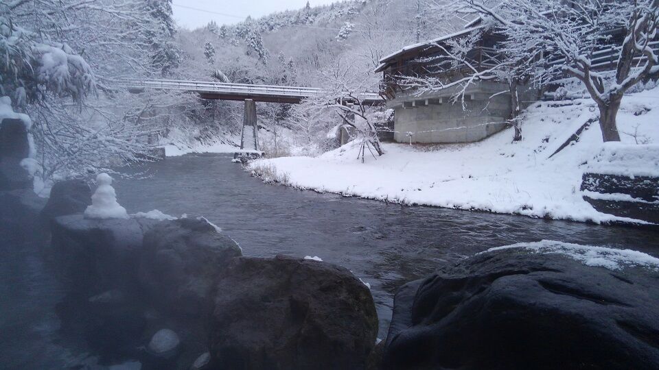 翌朝の窓外の風景。眼下には豊沢川の清流。木々は樹氷のように見えました。