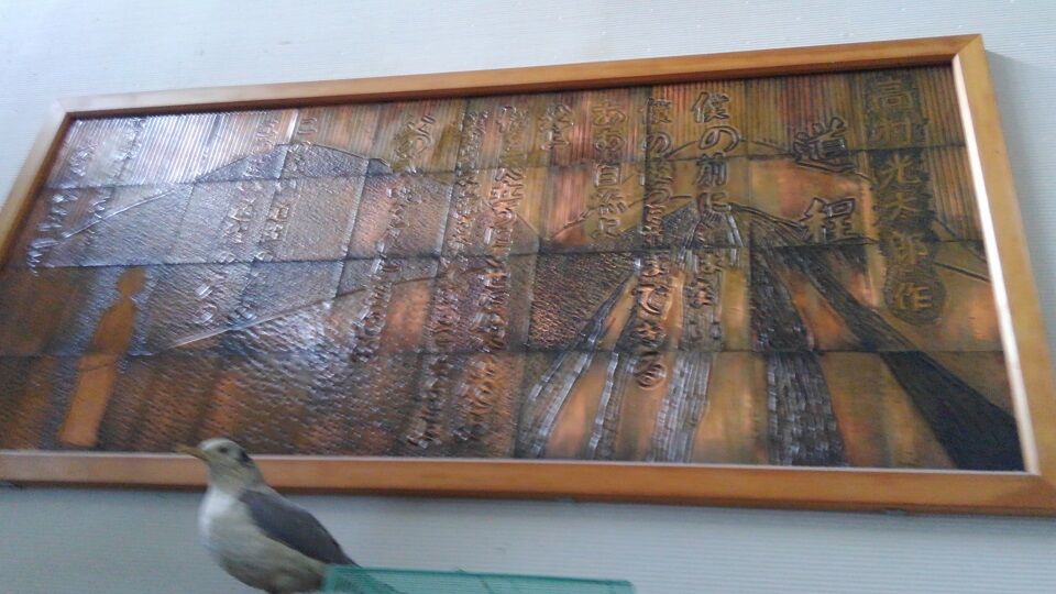 現役の小学校だった頃、卒業記念として昔の児童さん達が作ったらしい、大きな銅板のプレート。地元ゆかりの偉人ということでしょう、光太郎詩「道程」がモチーフです。