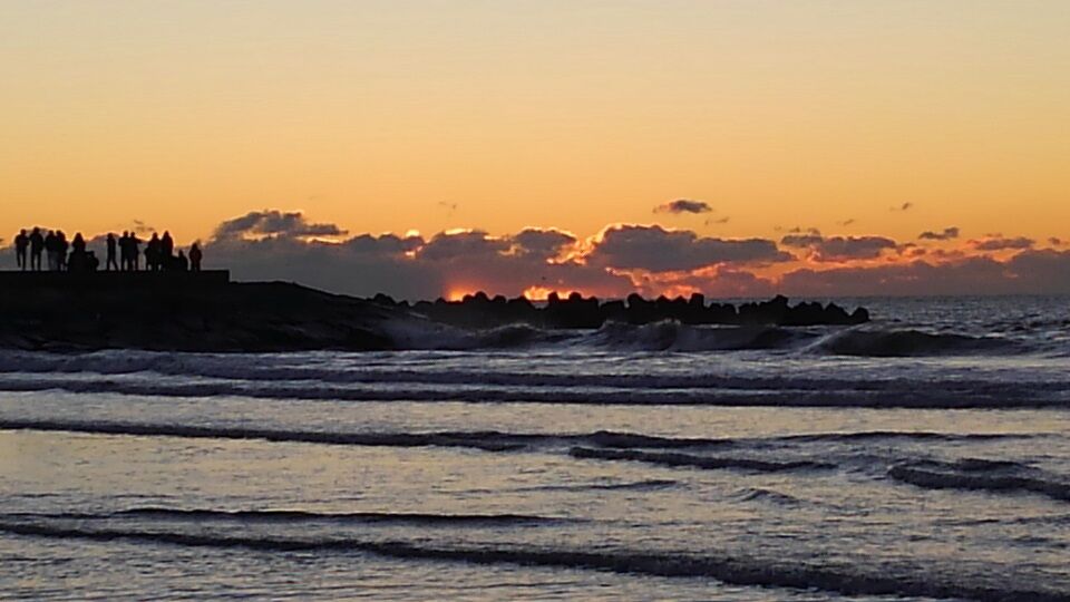 6時46分、水平線から太陽が顔を覗かせているはずですが、この季節、西高東低の冬型の気圧配置のため、絶対といっていいほど、水平線上には雲がかかっています。6時50分頃、その雲の上に太陽が。
