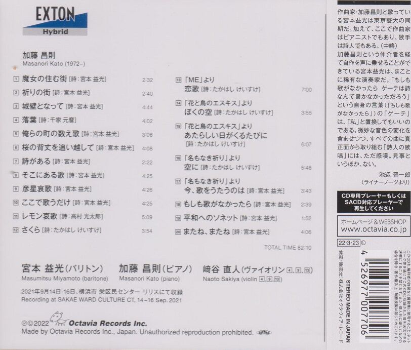 この「レモン哀歌」がプログラムに入っていたコンサート等は、当方が把握している限り、令和元年(2019)に加耒徹氏の歌唱で「歌道Ⅱ」と題した公演が福岡と東京で行われた他、同年の「4人のバリトンコンサート ハンサムなメロディー」でも加耒氏が歌われました。また、今回のCDで歌われている宮本氏で、「午後の音楽会 第136回プレミアムコンサート 宮本益光×加藤昌則 デュオリサイタル」。こちらは今年の2月、横浜での公演でした。それから情報を把握しておらずご紹介出来ませんでしたが、先月末に愛媛県八幡浜市で開催された「宮本益光バリトンリサイタル SINGER SONGWRITER 加藤昌則歌曲集」でも演奏されています。CDの発売記念的なコンセプトでしょう。宮本氏は八幡浜ご出身だそうです。