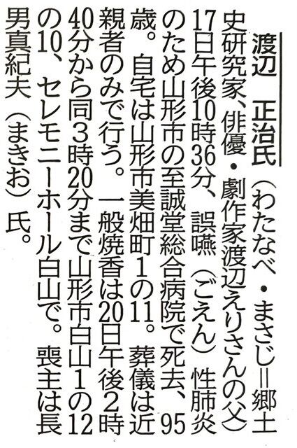 ▼▽俳優渡辺えりさんの父正治(まさじ)さんも教師として同じ時代を生き、山形市で95年の生涯を閉じた。会葬者に手渡した「お礼の言葉」でえりさんが綴(つづ)っていた。父は東京の軍需工場で働き、九死に一生を得る。終戦後は教育の大切さに思い至り働きながら山形大に入り先生となる。