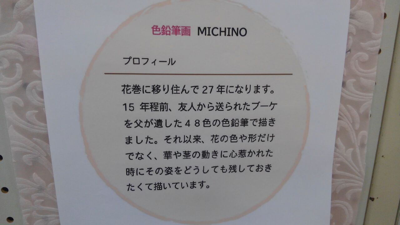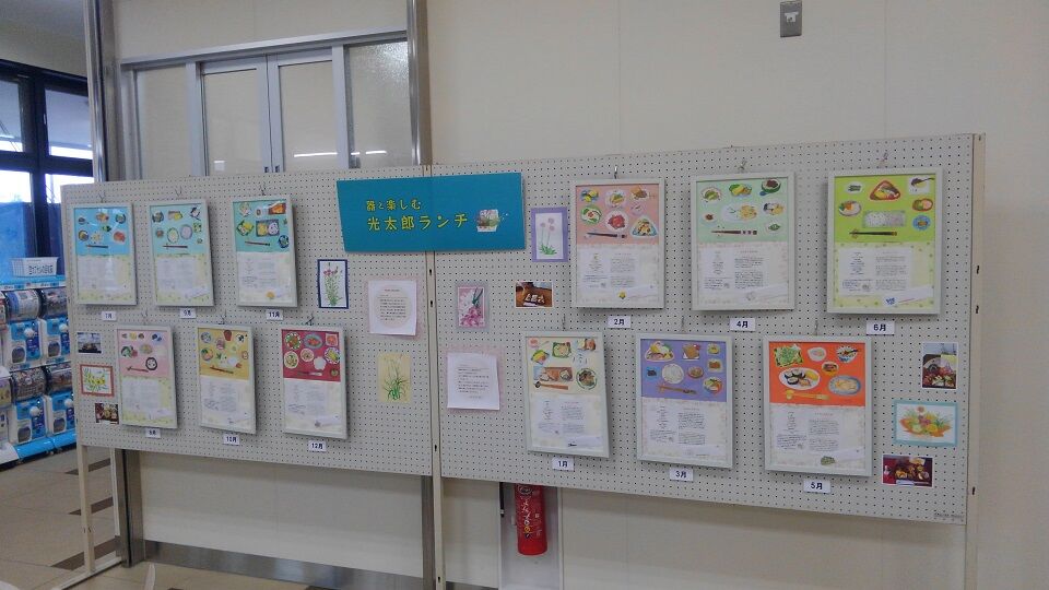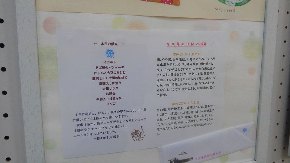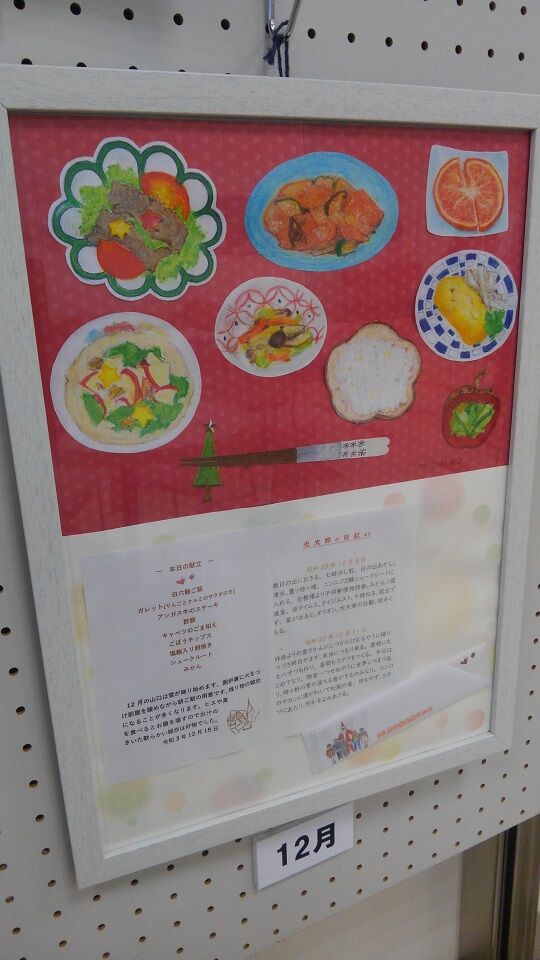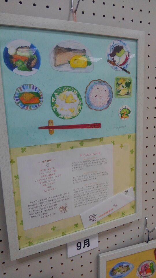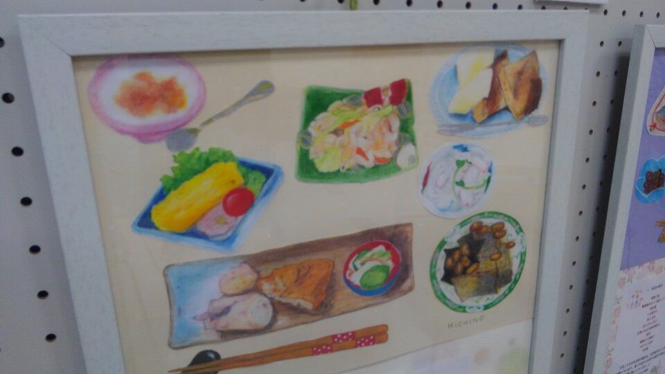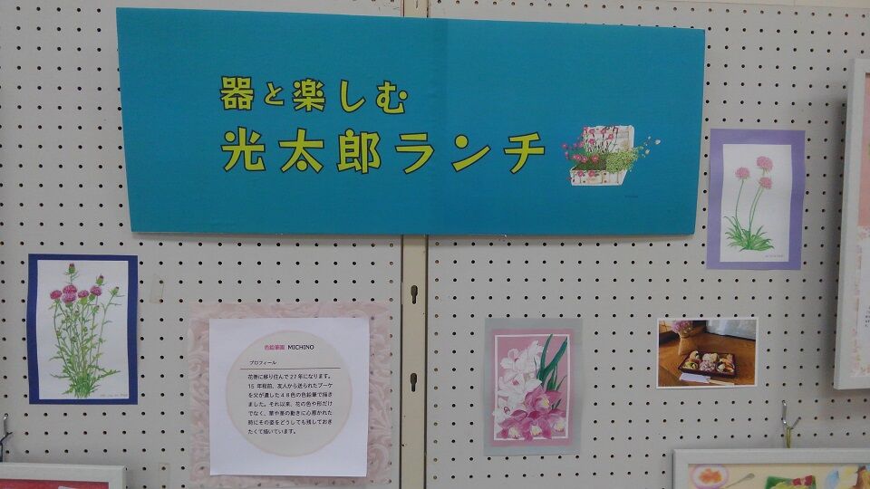 その隣では、地元ご在住のMICHINOさんという方の色鉛筆画で「器と楽しむ光太郎ランチ」。こちらの道の駅のテナント「」さんで、毎月15日に販売されている豪華弁当「」を洒落た器に盛りつけて描いた作品です。