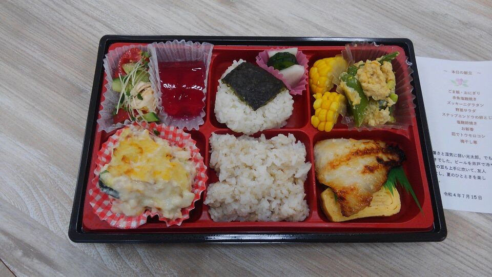 この日のメニューは、「ごま飯・おにぎり」、「赤魚塩麹焼き」・「ズッキーニグラタン」、「野菜サラダ」、「スナップエンドウの卵とじ」、「塩麹卵焼き」、「お新香」、「茹でトウモロコシ」、「梅干し寒」。彩りも鮮やかですし、栄養バランスもしっかり考えられていますね。