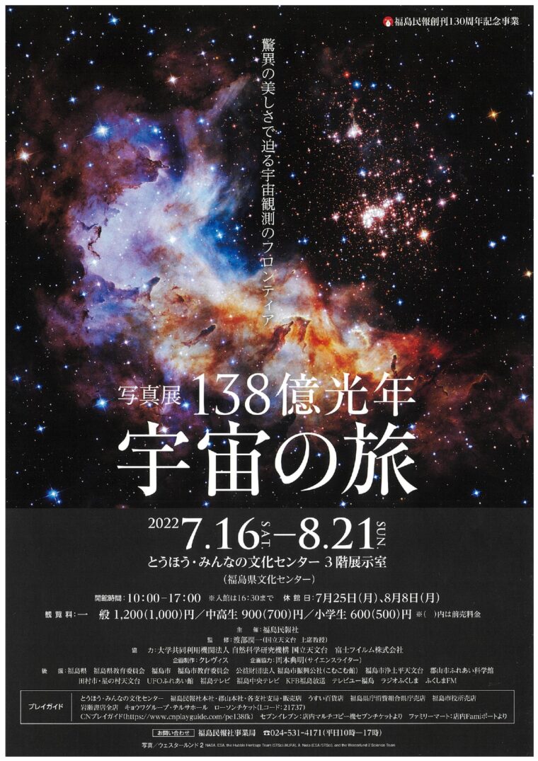 百億光年以上も離れた星々に間近に接し、想像力は果てなく広がる。きょう十六日から八月二十一日まで福島市のとうほう・みんなの文化センター(県文化センター)で開かれる写真展「138億光年 宇宙の旅」は、人類の英知を集めた最新画像で見る人を無限の時空へいざなう。地球や自らの存在を考える貴重な機会になる。
