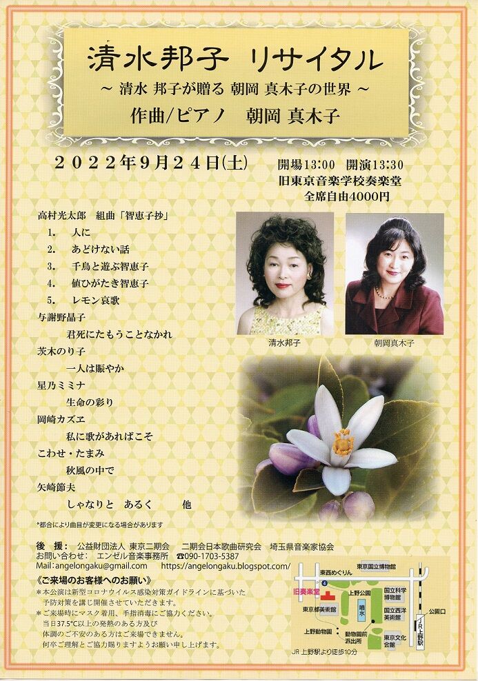 朝岡真木子氏作曲の独唱歌曲を、清水邦子さんという方が歌われるコンサート。