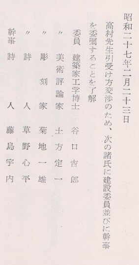 「万安」は「万安楼」。現在は銀座タワーとなっている場所です。「十和田委員会」は、この年10月に除幕された光太郎生涯最後の大作「十和田湖畔の裸婦群像(通称・乙女の像)」の在京建設委員会。その解散式という名目でしたが、気の置けないメンバーでもあり、忘年会的な要素が強かったように思われます。一応、これで「乙女の像」がらみの諸々は全て終了、ということにはなりましたが。
