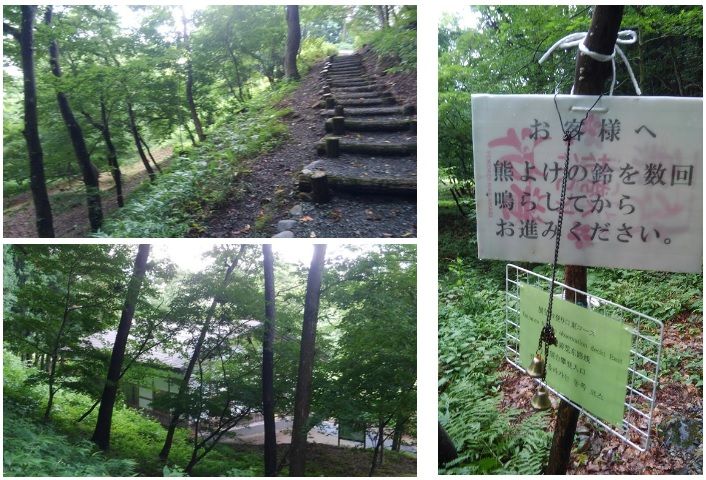 そこに至る山道。ちょっとしたハイキングコースです。ふり返ると足下に山小屋。熊が出ます。
