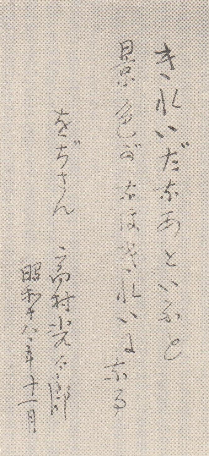 『をぢさんの詩』は、翼賛詩もたくさん含む実に残念な詩集ですが(「これこそ光太郎詩の真骨頂」とありがたがる愚か者も居て困ります)、時局とまったく関係のない短句を揮毫してあげたところに、救いを感じます。