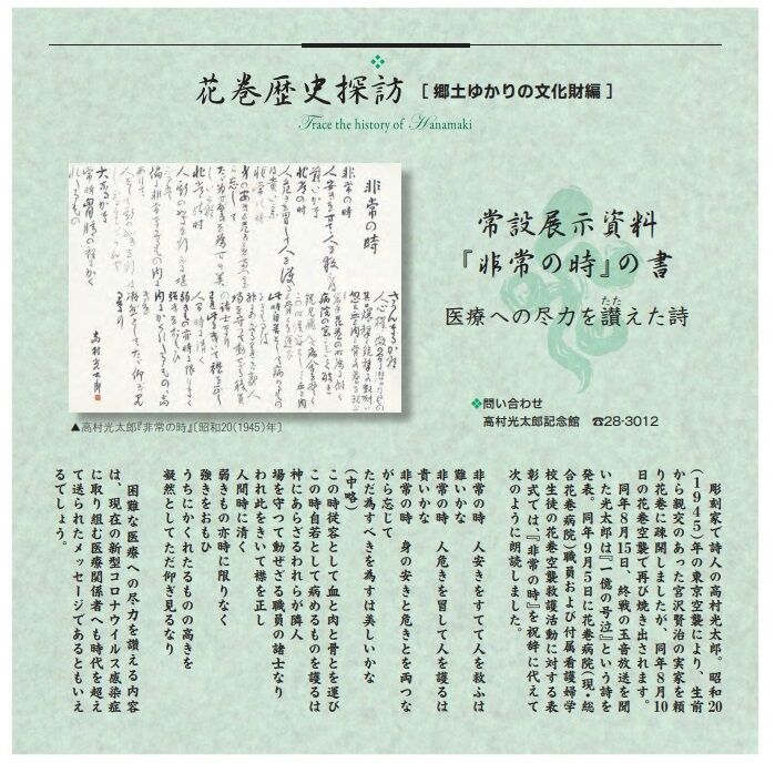 ところが、この記事が出た直後、コロナ禍のため9月13日(月)までの休館が発表されました。ただ、同展、会期は9月26日(日)までの予定ですので、再開後も観覧可能でしょう。似たような件ですが、岩手花巻の高村光太郎記念館さん、8月14日(土)から休館となり、当初予定では今日までのはずでしたが、休館期間が9月12日(日)まで延長、と発表されています。休館前に開催されていた企画展「光太郎の三陸廻り」は、最初の計画では昨日までの予定でしたが、そのまま終了なのか、期間を延長するのか、未定のようです。
