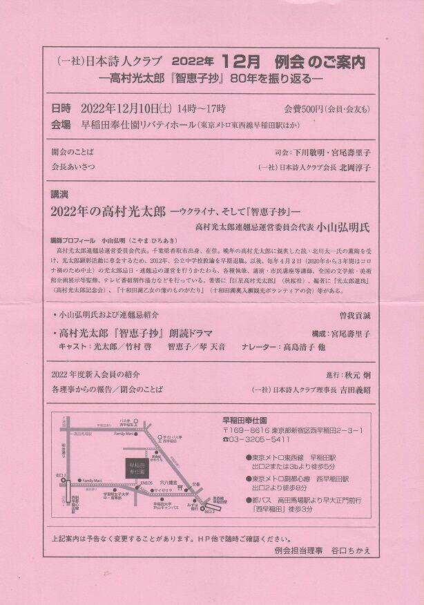 昨日まで、このブログサイトでは光太郎歿後年譜的に今年1年の主な出来事をご紹介して参りましたが、振り返ってみると、コロナ禍前の状況にかなり戻った感がしました。一昨年はとにかく自粛・自粛で各種イベントが軒並み休止、昨年もその余波がまだ続いていました。それが今年、特に秋以降はイベントの開催がまた以前のように為されるようになってきたように思われ、ありがたく存じました。ただ、関係者の方にコロナ感染が出て、中止となった公演等もあり、まだまだ予断を許さぬ状況ですね。