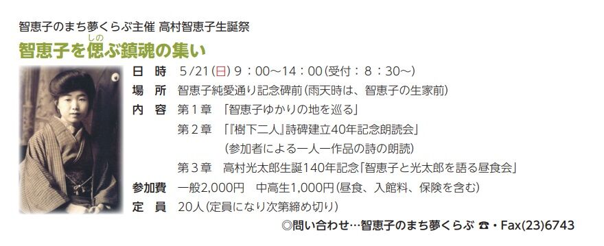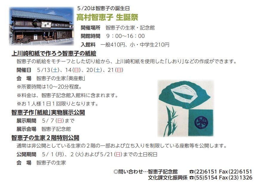二本松市の智恵子の生家・智恵子記念館は27日、同市出身の美術家高村智恵子の誕生日の5月20日にちなんだ恒例イベント「生誕祭」を始めた。5月21日まで、紙絵の実物展示や智恵子の居室特別公開など多彩に繰り広げている。