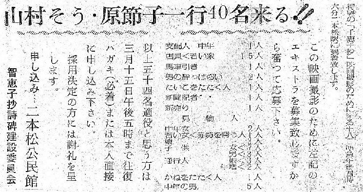 東宝映画「智恵子抄」の二本松ロケが、高村智恵子の生家があった安達村油井(現二本松市油井)の旧長沼家で始まった。