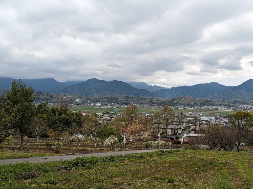 実はここから1㌔ほどの所に亡父の実家がありまして、このあたりは子どもの頃からよく訪れていました。祖父母や伯父らの眠る墓もありますし。今回はその墓参も目的の一つでした。下記は残照館さん前から見た亡父実家・共同墓地方面です。