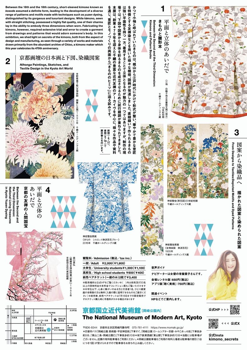 本展は近世から近代のきものの優品や、近世の流行を支えた雛形本などの資料、さらに円山応挙から始まる京都画壇の展開と染織図案との関わり、図案を染織作品へと応用する過程、染織図案の流行が他の工芸品とも共有するものであったことも紹介。これまでにない視点から「きもののヒミツ」に 迫ります。