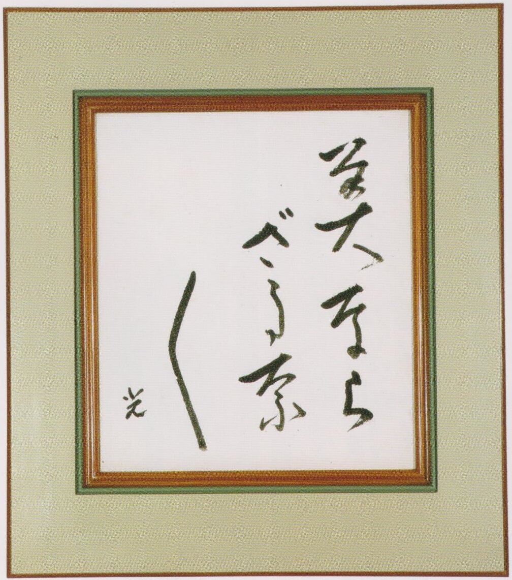 他の揮毫でも、平仮名の「し」をやたら長く書くのが光太郎書の一つの特徴。この「し」の書体が真贋を見極める一つのポイントです。もっとも、贋作作者もそれをわかっていて似せようとするのでしょうが。