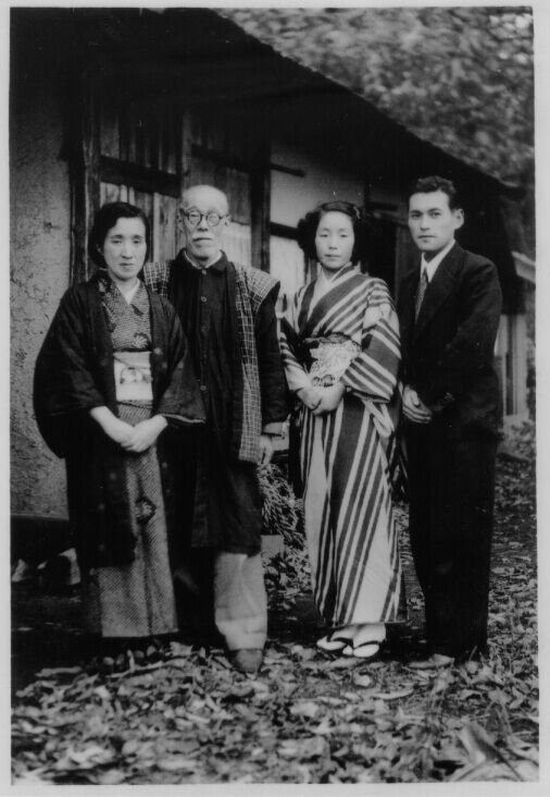 光太郎とも交流のあった歌人の前田夕暮に師事、奥様ともども歌誌『地中海』同人としてもご活躍。そして昭和26年(1951)、奥様との新婚旅行で花巻郊外旧太田村の光太郎の寓居を訪ねられました。右上の画像がその際のもの。右端が氏で、そのお隣が奥様、光太郎、左端はお二人を光太郎の元に案内してくれた花巻温泉の仲居さん・八重樫マサです。