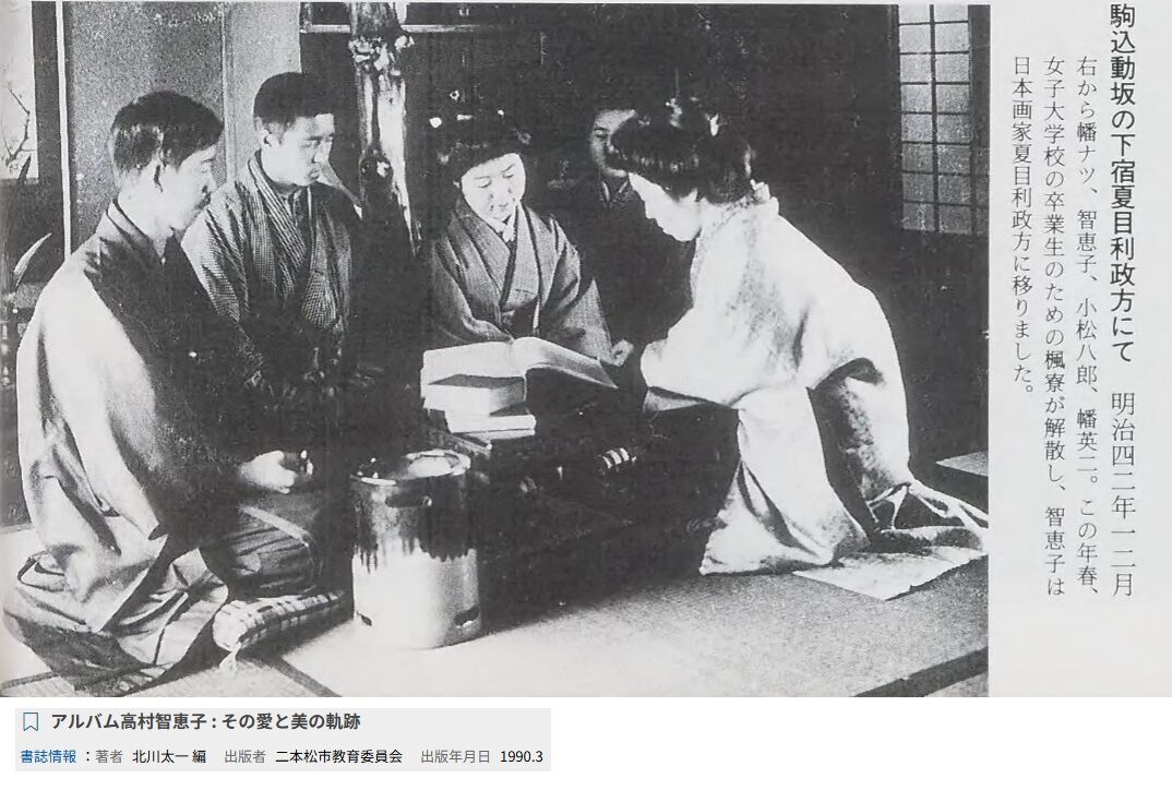 そして夏目利政と言えば、光太郎を知る前の智恵子が、利政の父・音作(象牙彫刻師だったとのこと)の家に下宿をしていたことでも知られています。明治40年(1907)に日本女子大学校を卒業した智恵子は、卒業生用の楓寮に入寮していましたが、同42年(1909)、楓寮が閉鎖となりました。おそらくその直後は寮近くの女子大学校の先輩だった永野初枝宅に一時的に厄介になったようですが、同じく女子大学校の同級生だった幡ナツ(旧姓・小松)が夫の英二と共に住んでいた本郷区動坂町(現・文京区本駒込)の夏目宅を紹介してくれたとのこと。同44年(1911)春まで、智恵子はここに住んでいたようです。