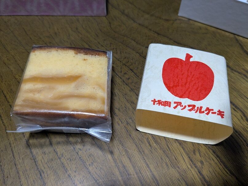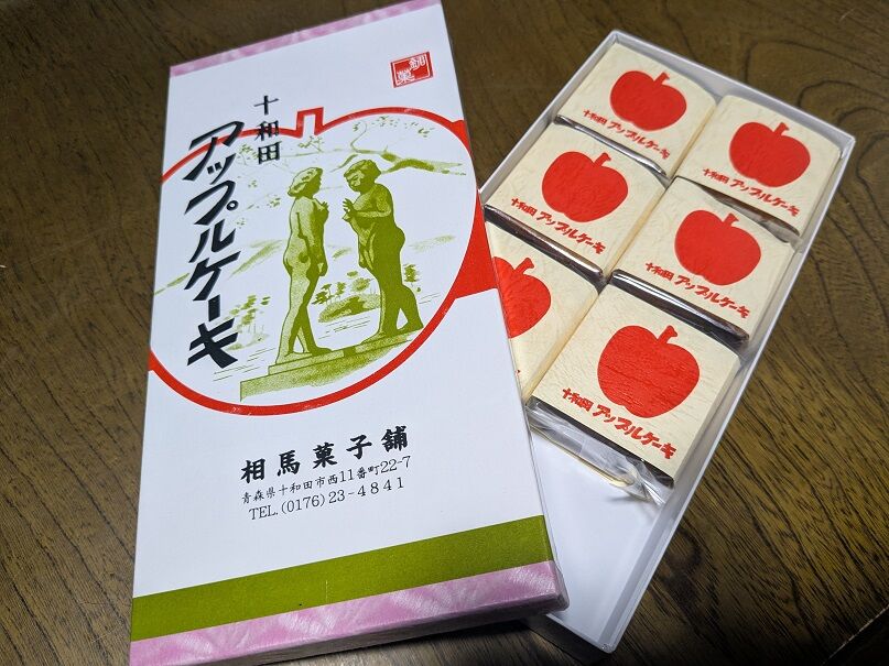 十和田市の相馬菓子舗さんで販売されている「十和田アップルケーキ」。リンゴの果肉を練り込んだずしりと重いパウンドケーキです。スポンジのしっとり感と当方大好物のリンゴのシャキシャキした歯触りのバランスが絶妙でした。箱に「乙女の像」をあしらっていただき、ありがたい限りです。ロゴの昭和感もたまりません(笑)。