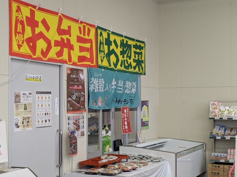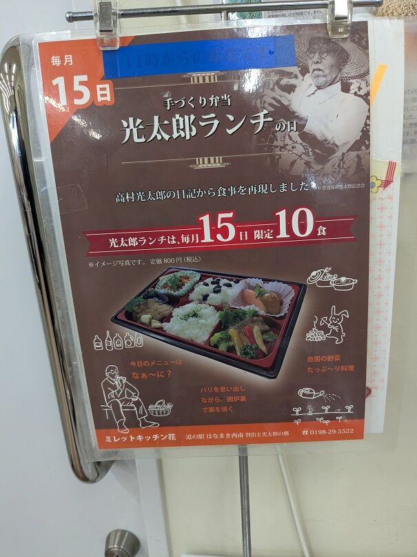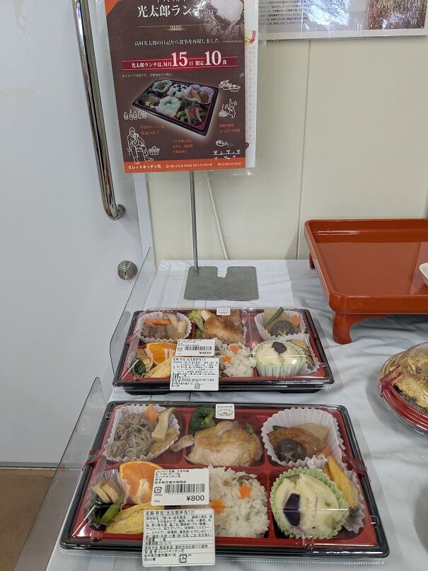 その右下に、弁当やお総菜を販売なさっているミレットキッチン花(フラワー)さんがあります。こちらでは毎月15日、豪華弁当「光太郎ランチ」を限定10食で販売中。ちょうど15日でしたので、「どれどれ」と見に行きました。