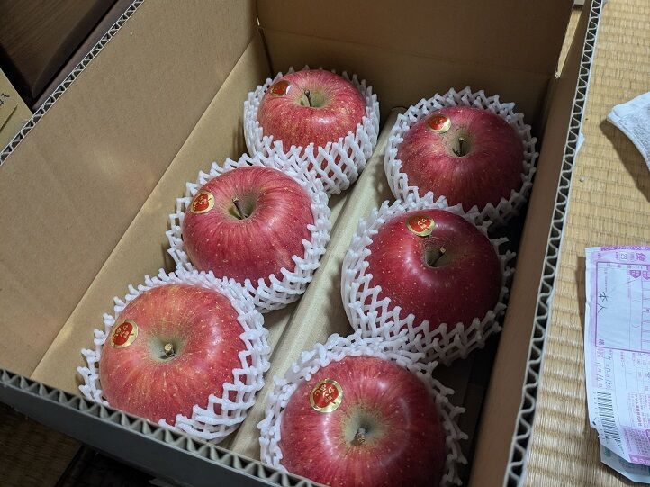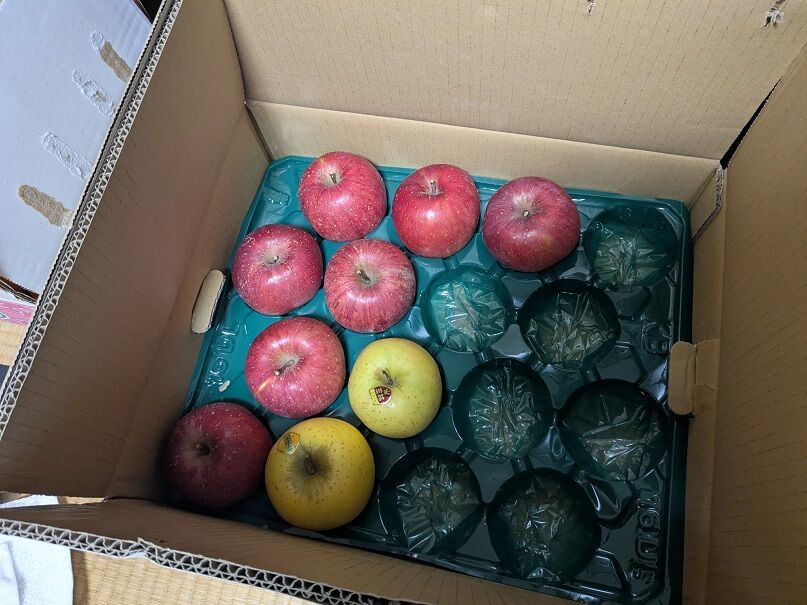 まず農産物等の直売や土産物等の販売を行っている「すぎの樹」さんで、林檎を箱買いして自宅兼事務所に発送(左下)。この季節のルーティンです。後述のやつかの森LLCさんから既に大量に送られてきている(右下)のですが、いくらあっても困りませんので(笑)。