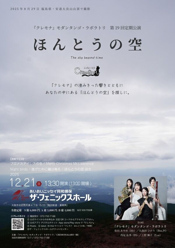 大阪市のあいおいニッセイ同和損保ザ・フェニックスホールさんで木管四重奏団「クレモナ」さんの「モダンタンゴ・ラボラトリ第19回定期公演「ほんとうの空」」が開催され、光太郎詩「あどけない話」由来のオリジナル曲「ほんとうの空」が初演されました。