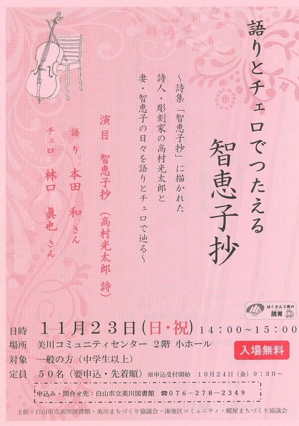 さらに同日、石川県白山市の美川コミュニティセンターさんで「語りとチェロでつたえる~智恵子抄~」公演があり、朗読家・本田和氏による「智恵子抄」朗読が為されました。