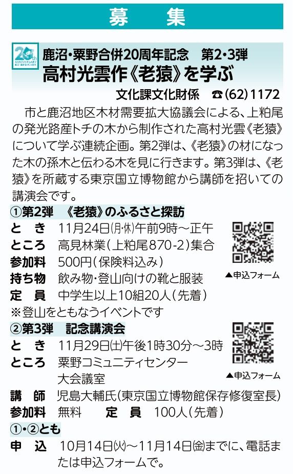 栃木県鹿沼市で「《老猿》のふるさと探訪」が行われ、光雲作木彫「老猿」の材となったトチノキの子孫の見学会が催されました。11月29日(土)には児島大輔氏(東京国立博物館保存修復室長)による記念講演会も開催されました。