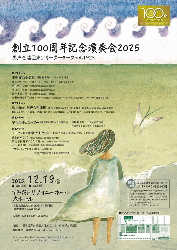墨田区のすみだトリフォニーホールさんで「男声合唱団東京リーダーターフェル1925 創立100周年記念定期演奏会2025」が開催され、清水脩氏作曲の「或る夜のこころ」「智恵子抄巻末のうた六首」が演奏されました。