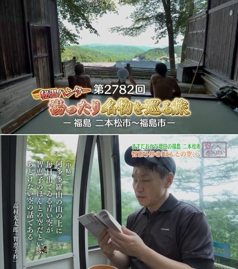 同日、地上波日本テレビさんで「遠くへ行きたい ますだおかだ増田が福島へ 名湯に絶品ソースかつ丼!」の放映があり、「智恵子抄」に触れつつ安達太良山が取り上げられました。