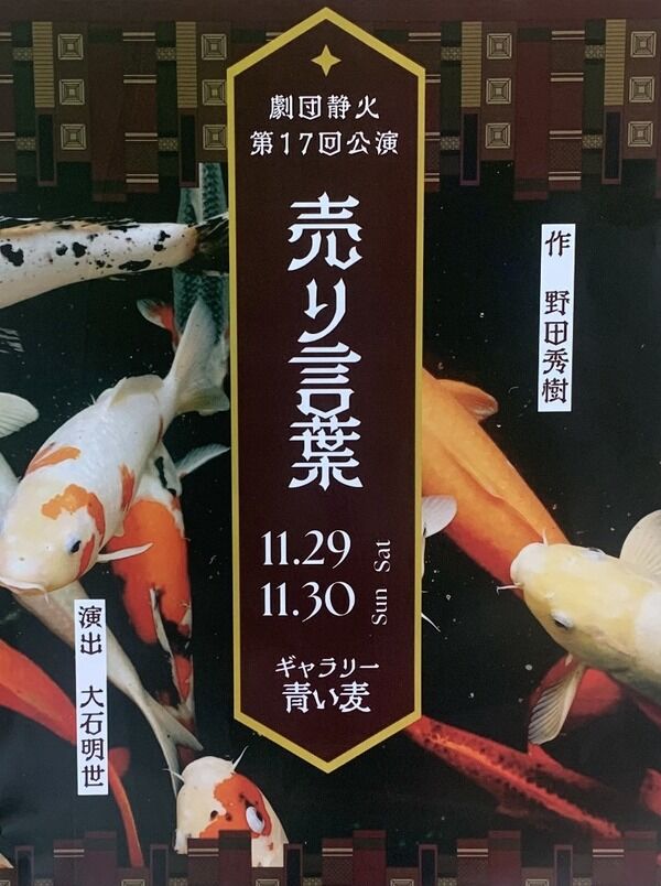 静岡市のギャラリー青い麦さんで劇団静火第17回公演『売り言葉』が開催され、野田秀樹氏脚本の登場人物は智恵子だけの演劇「売り言葉」が上演されました。