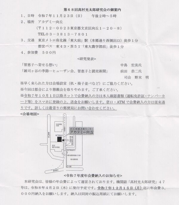 同日、文京区のアカデミー向丘さんで「第68回高村光太郎研究会」が開催され、「智恵子へ寄せる想い」 吹木文音(中島宏美)氏(日本詩人クラブ・栃木県現代詩人会理事)、「雑司ヶ谷の季節――ヒューザン会、智恵子と読売新聞」 前田恭二氏(武蔵野美術大学教授)の2本の発表がありました。