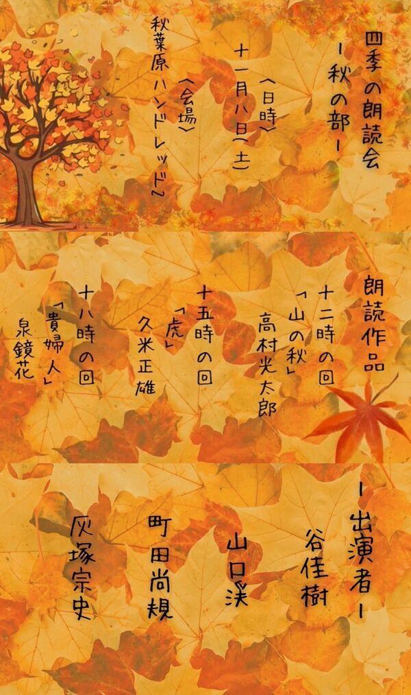 台東区の秋葉原ハンドレッド2さんで「四季の朗読会〜秋の部〜」が開催され、光太郎エッセイ「山の秋」が取り上げられました。
