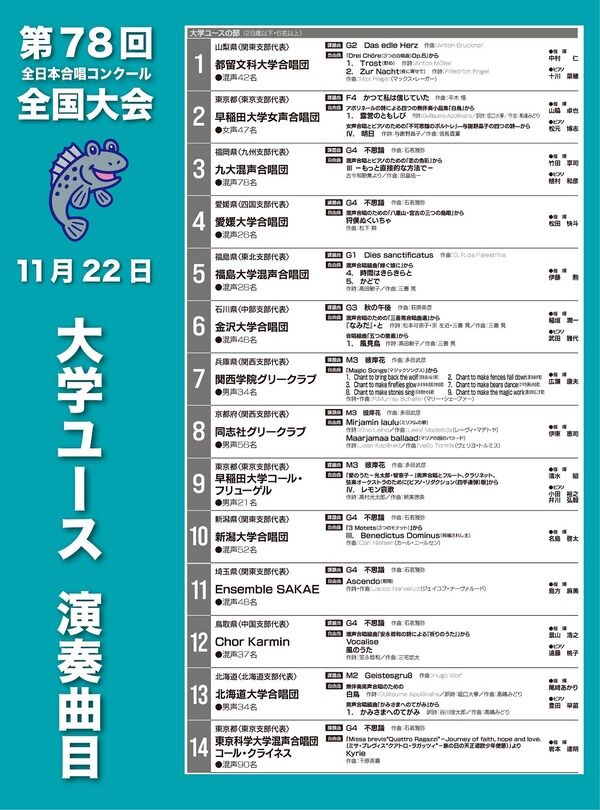 佐賀市文化会館で開催された「第78回全日本合唱コンクール全国大会の大学職場一般部門」で、早稲田大学コール・フリューゲルさんが、自由曲に新実徳英氏作曲の「愛のうた -光太郎・智恵子-男声合唱とフルート、クラリネット、弦楽オーケストラのために」から「レモン哀歌」を演奏され、金賞及び日本放送協会賞を受賞されました。