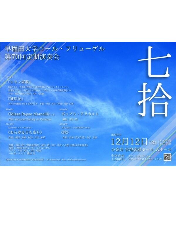 東京都小金井市の小金井宮地楽器ホールさんで早稲田大学コール・フリューゲルさんの第70回定期演奏会が開催され、新実徳英氏作曲の「愛のうた -光太郎・智恵子-男声合唱とフルート、クラリネット、弦楽オーケストラのために」から「レモン哀歌」が演奏されました。