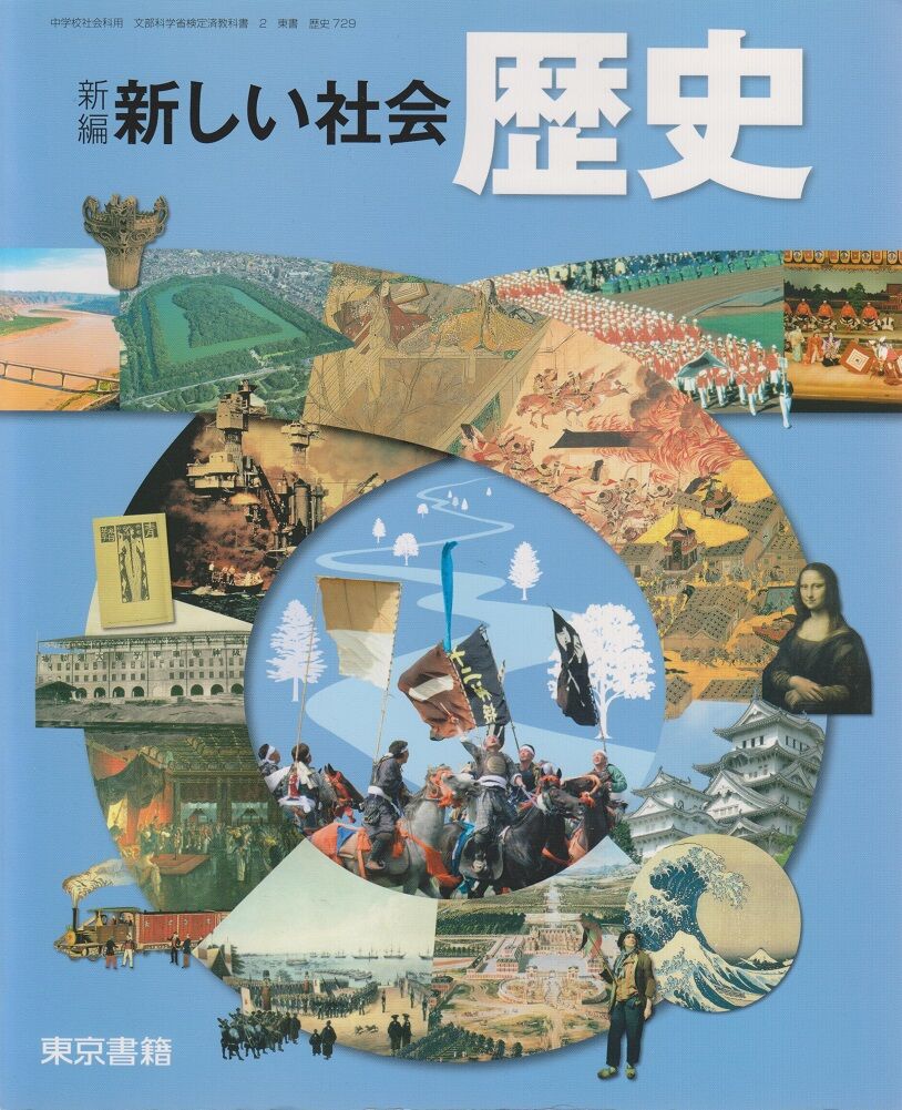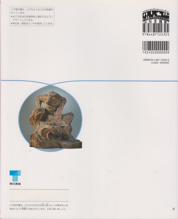 上画像は平成27年(2015)検定、同28年(2016)発行の東京書籍さん中学生向け歴史教科書。裏表紙に「老猿」があしらわれています。