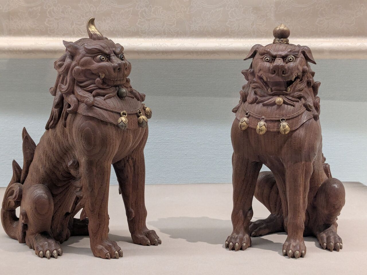 像高一尺ほど。阿形の宝珠、吽形の角、それから双方の眼や爪牙、そして首飾りに金彩が施されていますが、それ以外は素の木肌で木目を実に上手く生かした造り。見事でした。360度で見られず、光雲の銘も視認出来なかったのが残念でしたが(銘を見ると単独作か工房作かある程度判断出来ます)。