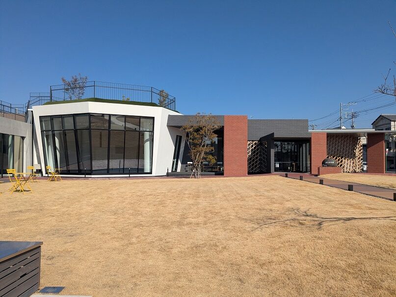 11年前に訪れた際には前身の佐野東石美術館という名称で、殺風景なビルの一角でしたが、一昨年にリニューアル。東石美術館さんを含む複合施設「東石スカイテラス」として生まれ変わりました。その名の通り、屋上は芝生の広がるテラスとなっており、前庭はイベントスペースとしても使用可。テラスに上がる階段が観覧席にもなる造りです。