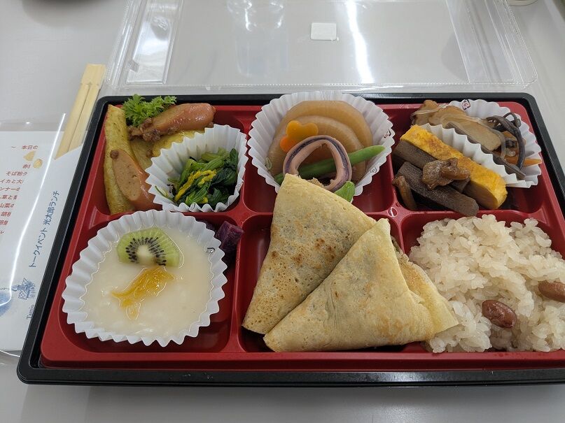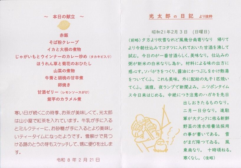 花巻で主に食を通じて光太郎顕彰に当たられているやつかの森LLCさん(今回の記念館さんでの展示、トークショー、冊子の発行にも御尽力)が光太郎日記などを元に、実際に光太郎が作ったメニューなどを参考に組み立て、道の駅はなまき西南(愛称・賢治と光太郎の郷)さんのテナント、ミレットキッチン花(フラワー)さんが毎月15日に限定10食で出品している弁当「光太郎ランチ」のスペシャルバージョンでした。