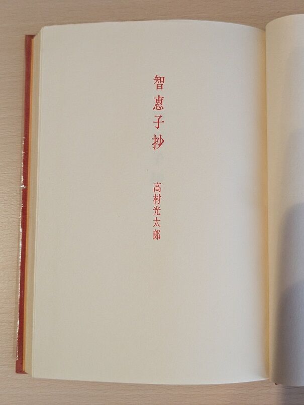 紙型は昭和26年(1951)に出た戦後新版と同一です。皇太子殿下と美智子さま(現・上皇ご夫妻)のご成婚記念という理由で表紙をおめでたい紅白の布装にし、「紅白版」として出されました。この頃になると結婚披露宴の引出物に『智恵子抄』というのが一つのトレンドだったそうで、そうしたところからの着想もあったように思われます。智恵子の最期を思うと複雑な気持ちになりますが……。