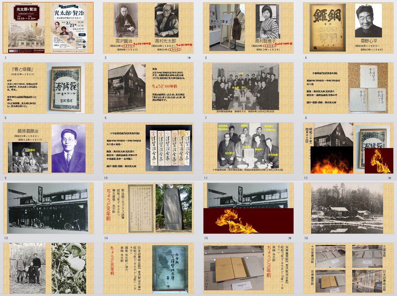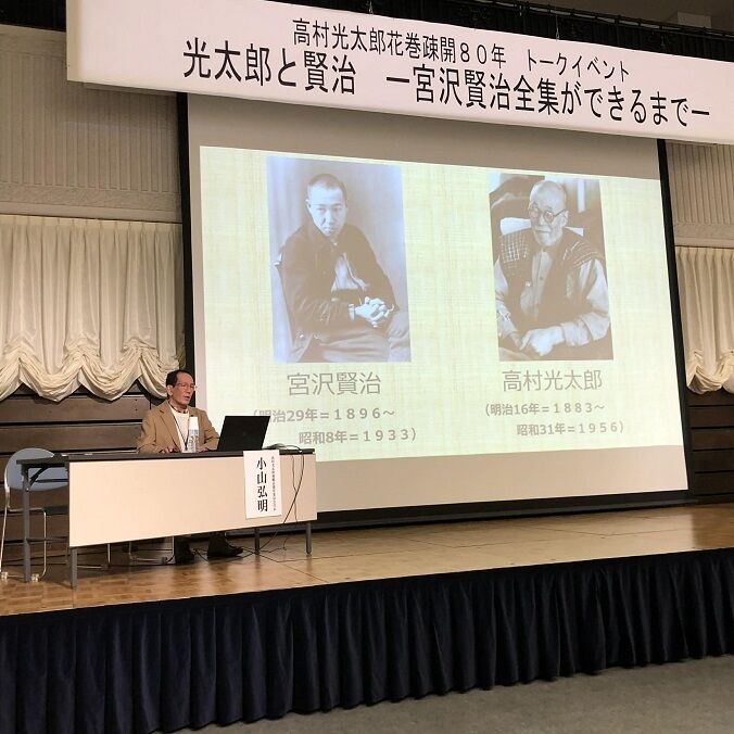 まず当方。20分ほどパワーポイントのスライドショーを使って語らせていただきました。光太郎と賢治のそもそものつながり、そこに介在した当会の祖・草野心平、生涯にたった1度の光太郎と賢治の出会い(ちょうど100年前です)、その後の4種類にわたる賢治全集への光太郎の関与、やはり賢治全集編纂に力を注いだ賢治実弟・清六や賢治の親友・藤原嘉藤治などについて。
