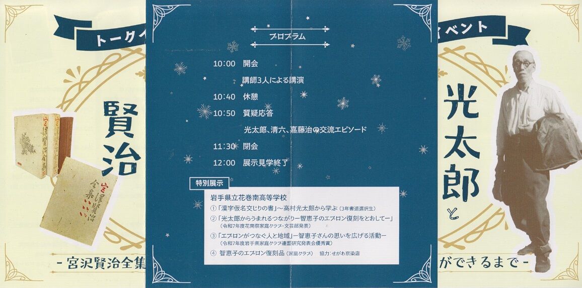 休憩を挟んで、質問を受け付けながらのフリートーク。和樹氏は、戦後の昭和21年(1946)から同24年(1949)にかけ、清六と光太郎の二人だけで編んだ日本読書組案版の『宮沢賢治文庫』について。特に「生徒諸君に寄せる」を中心に。