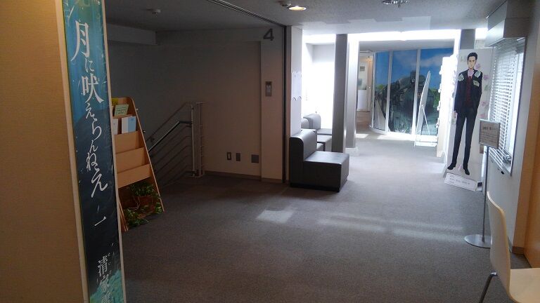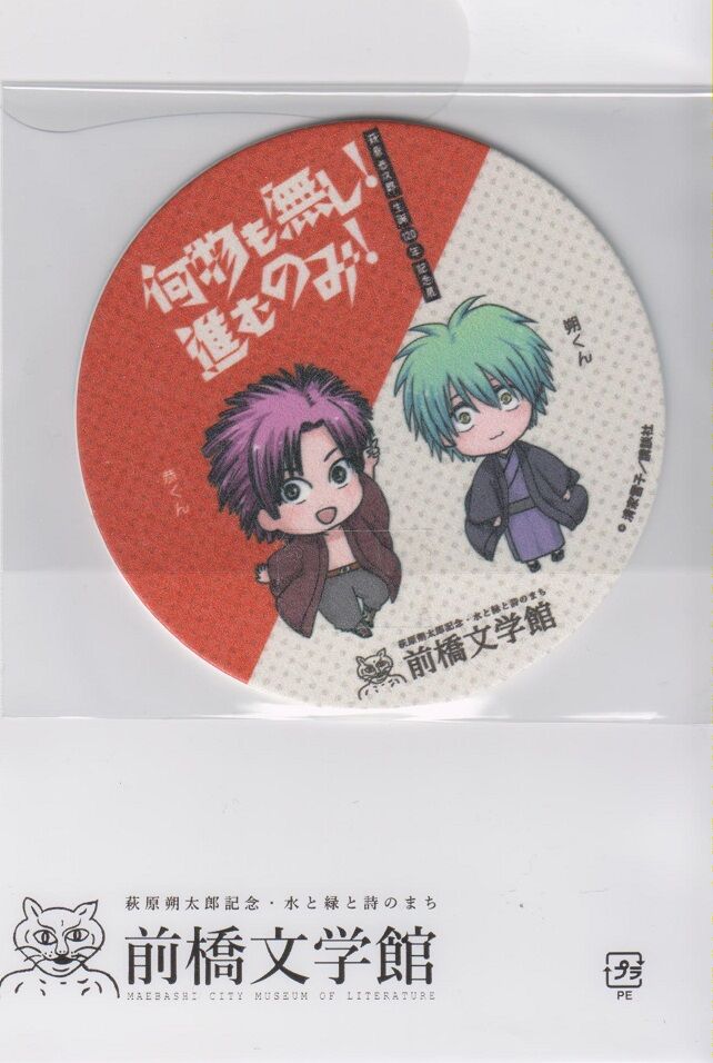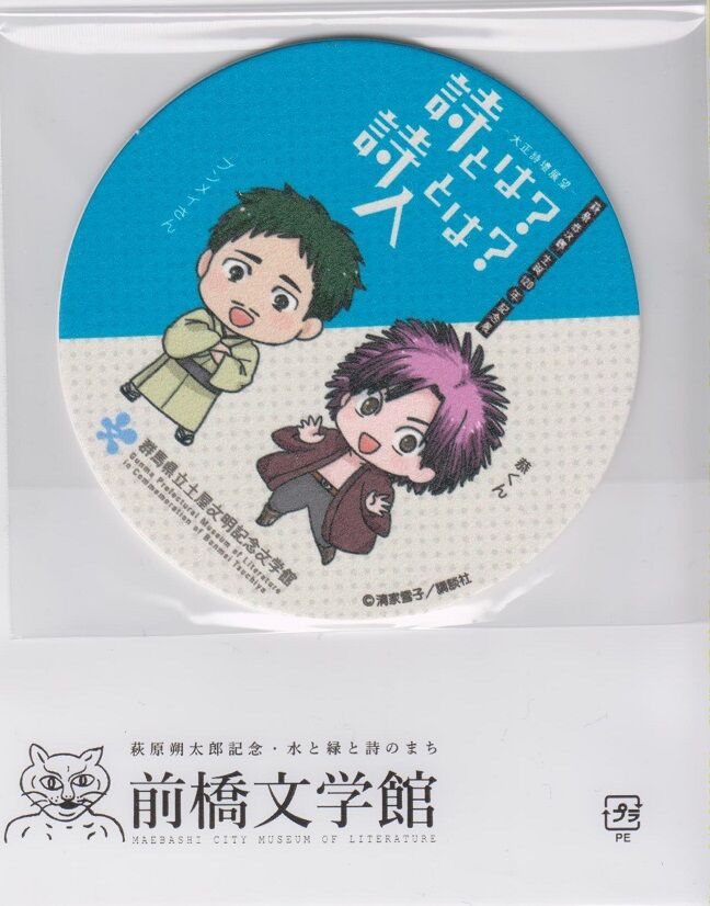 それから、こちらでもロビーに『月に吠えらんねえ』の展示。ちなみに両館の半券をコンプリートすると、オリジナルグッズがもらえるということで、いただいて参りました。群馬ということで、朔(朔太郎)、ブンメイ(土屋文明)、恭くん(恭次郎)があしらわれたコースターでした。