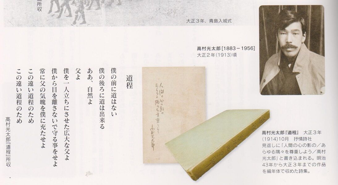 こちらの展示は、恭次郎をひときわ大きく紹介しつつ、全体としては大正詩壇を概観するというコンセプトで、したがって、光太郎に関してもそれなりに大きく取り上げられていました。代表作「道程」(大正3年=1914)がパネルに大きくプリントされ、詩集『道程』(同)が展示されています。