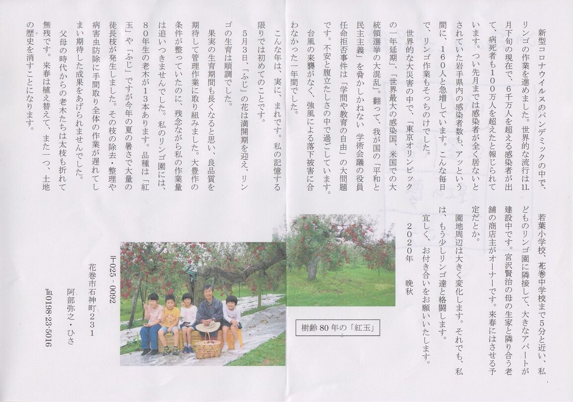 リンゴに関しては、宮沢賢治の教え子で、花巻で林檎園を経営していた阿部博とのからみ。平成27年(2015)、NHKさんの「趣味どきっ!女と男の素顔の書 石川九楊の臨書入門 第5回「智恵子、愛と死 自省の「道程」 高村光太郎×智恵子」」で取り上げられた「甘酸是人生」の書を贈られた人物です。