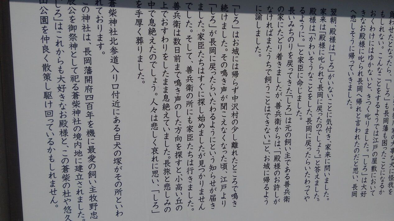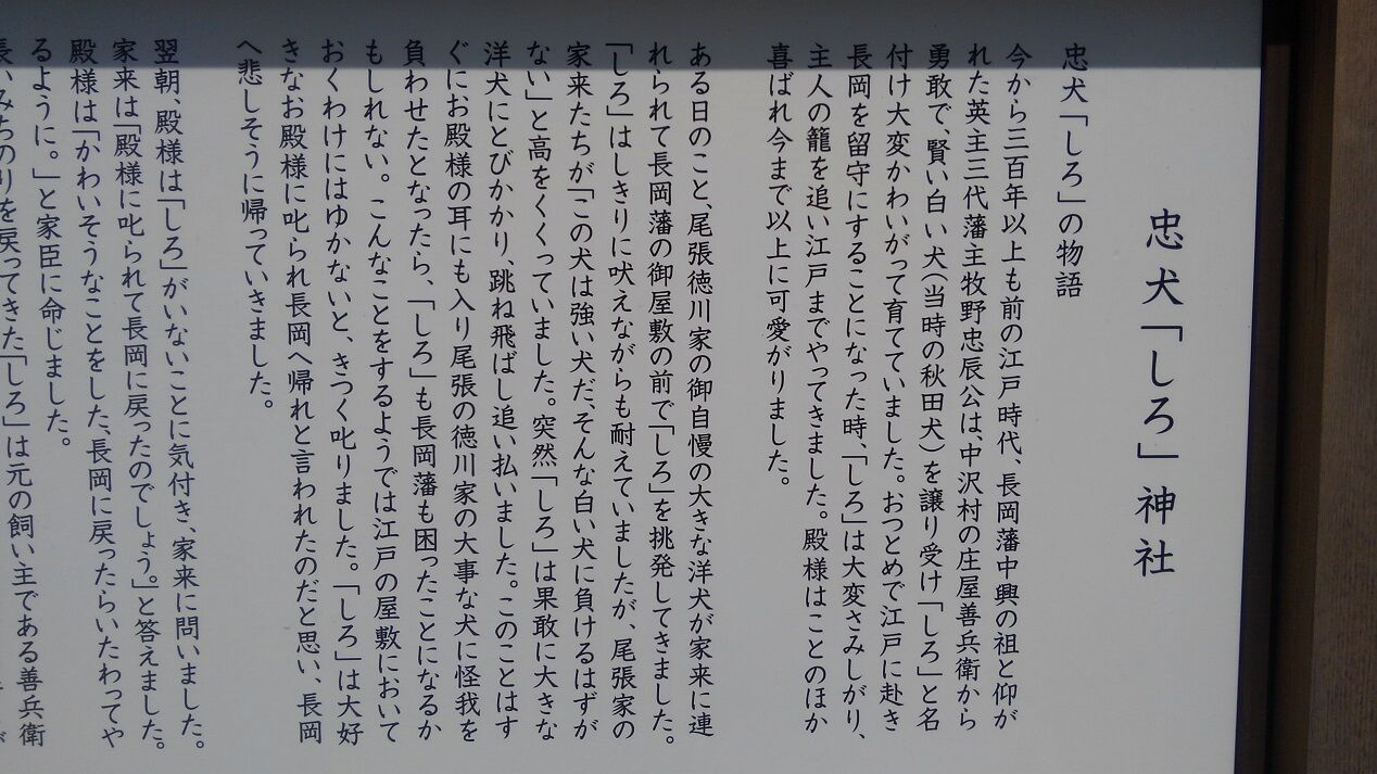かたわらに「忠犬しろ神社」。長岡藩のお殿様の愛犬「しろ」が祀られていました。長岡と江戸を自主的に往復したという凄いわんこです。