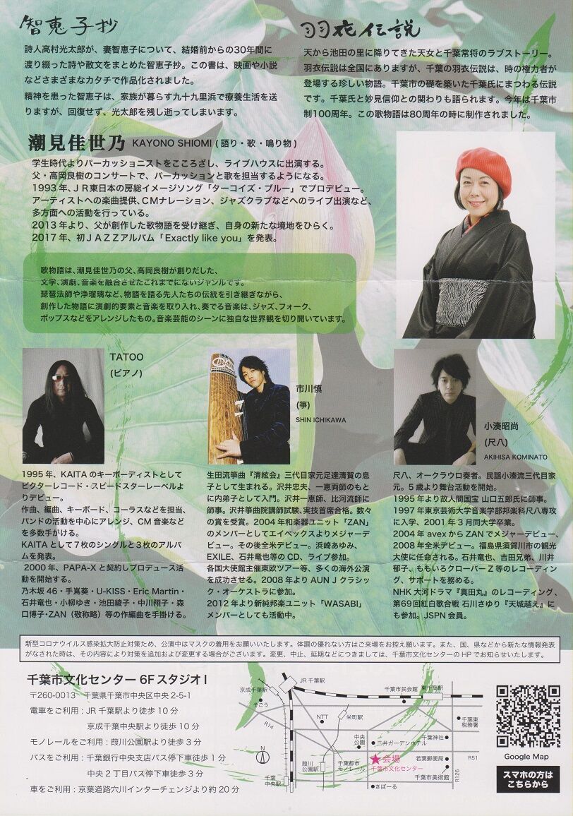 市制100周年を記念して、6月20日(日)千葉市文化センター6階 スタジオ1にて、歌物語コンサートを開催いたします。語ります物語は、千葉市の伝説「羽衣伝説」そして、高村光太郎の「智恵子抄」。歌物語で文学の名作・伝説を体感して下さい。どうかあたたかい応援をよろしくお願いいたします。只今チケット発売中です。