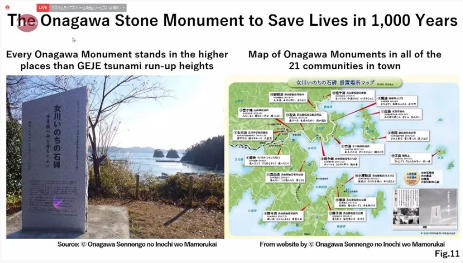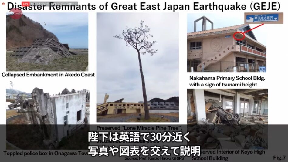 陛下は「災害の記憶を伝える」と題し、約25分間、写真や図を使って英語でスピーチ。発生から10年がたった東日本大震災の記録や被災者の体験について「時代を超えて継承していくことはとても大事なこと」と述べた上で、語り部活動や震災遺構、宮城県女川町の「1000年後のいのちを守る石碑」などを紹介した。