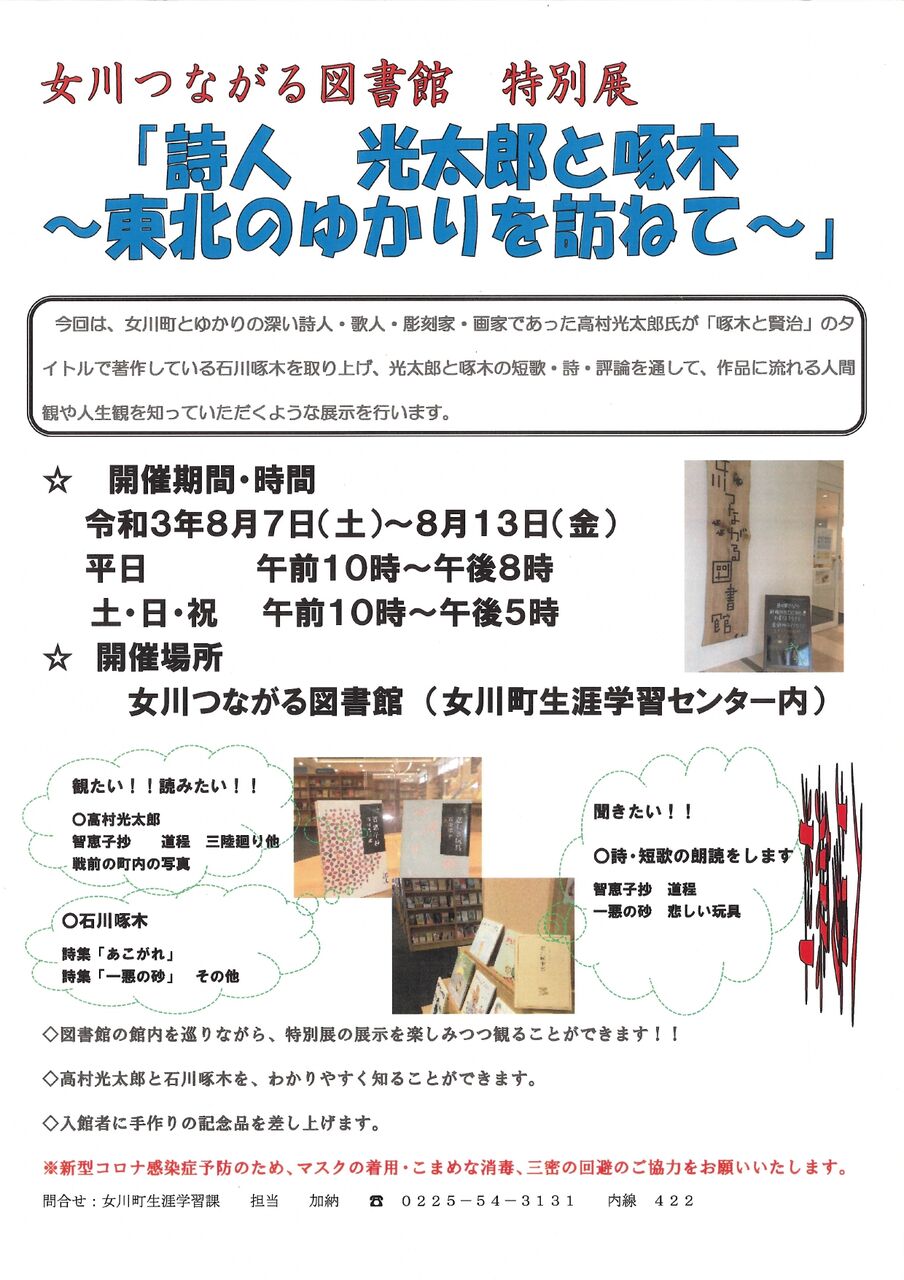 女川光太郎祭は、残念ながら、昨年に引き続きコロナ禍で中止となりましたが、町立の女川つながる図書館さんで、光太郎に関する展示をなさって下さいます。