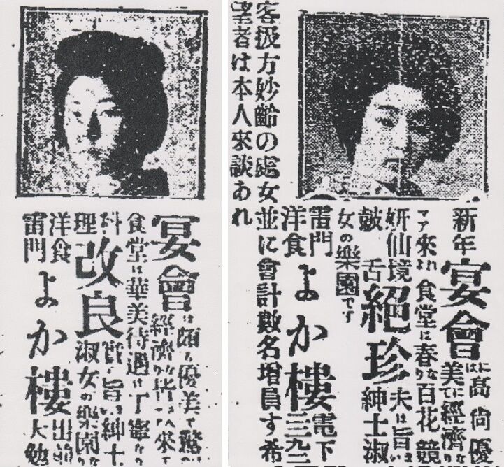 当時、よか楼では女給の顔写真を載せた新聞広告を盛んに出していたというので、お梅も写っているだろうと思い、調査した件を書きました。